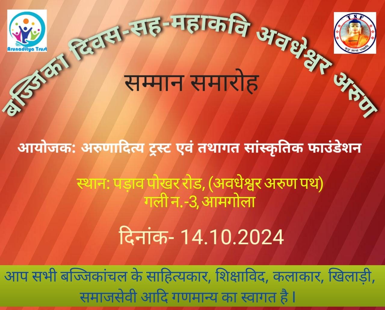 aapne sab bajjika bhashi evn bajjika ke kshetra me kaam kare wala sahityakar, lekhak, kavi, kalakar aadi ke sammanit karela Arunaditya Trust 14 october 2024 ke Bajjika diwas ke awsar par samman samaroh ayojit kar rahal haye.
