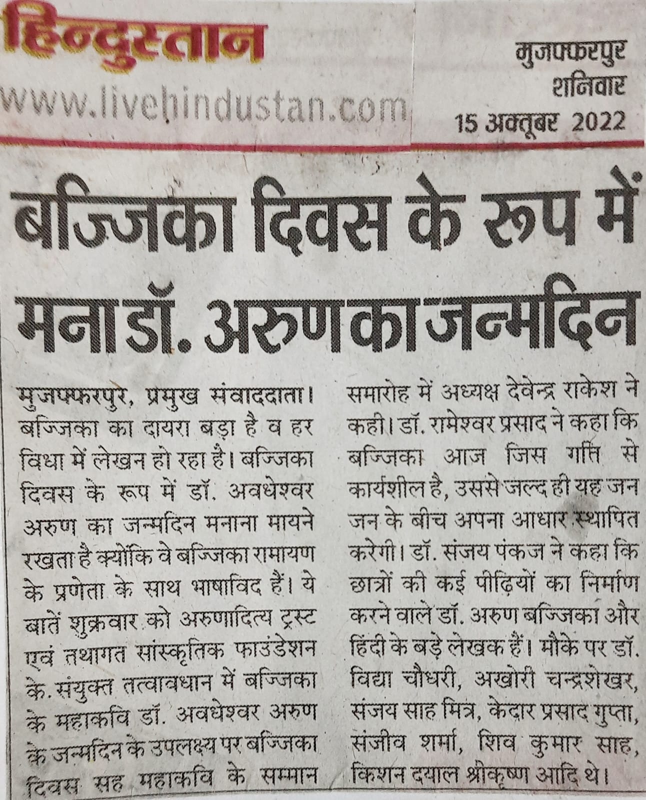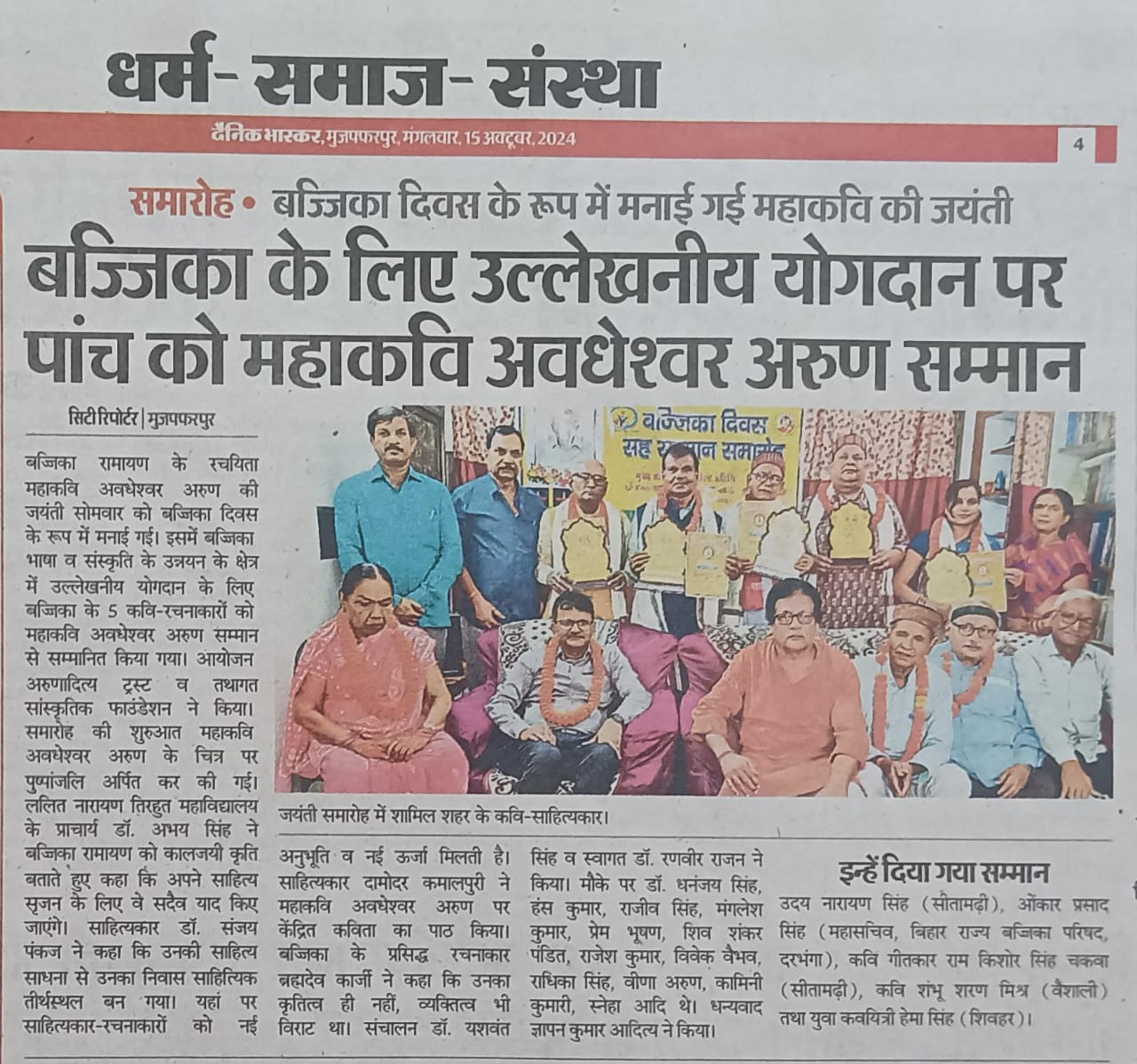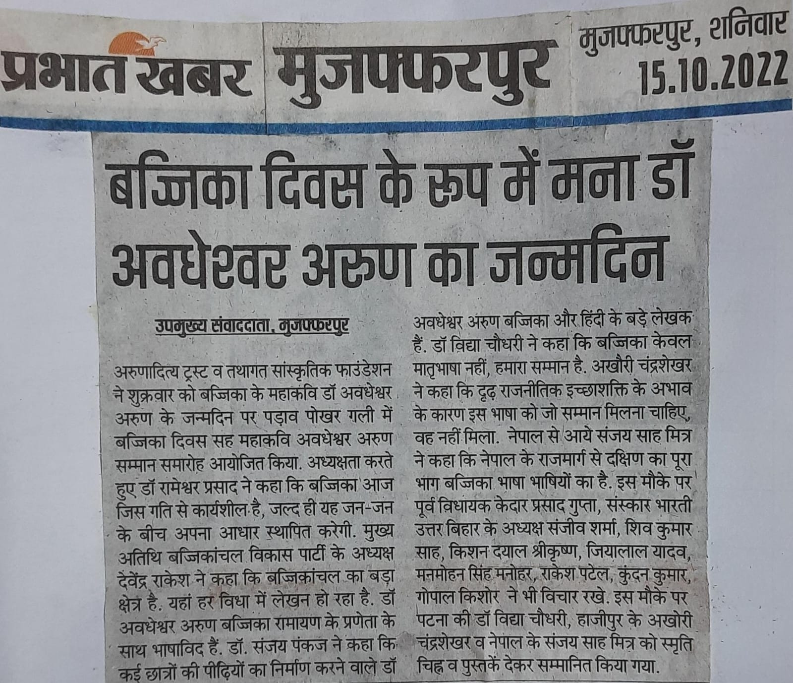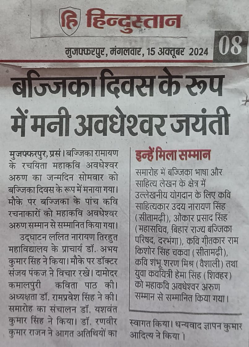 बज्जिका दिवस के रूप में मनायी गयी महाकवि अवधेश्वर अरुण की जयंती एवं बज्जिका दिवस सह महाकवि अवधेश्वर अरुण सम्मान समारोह
